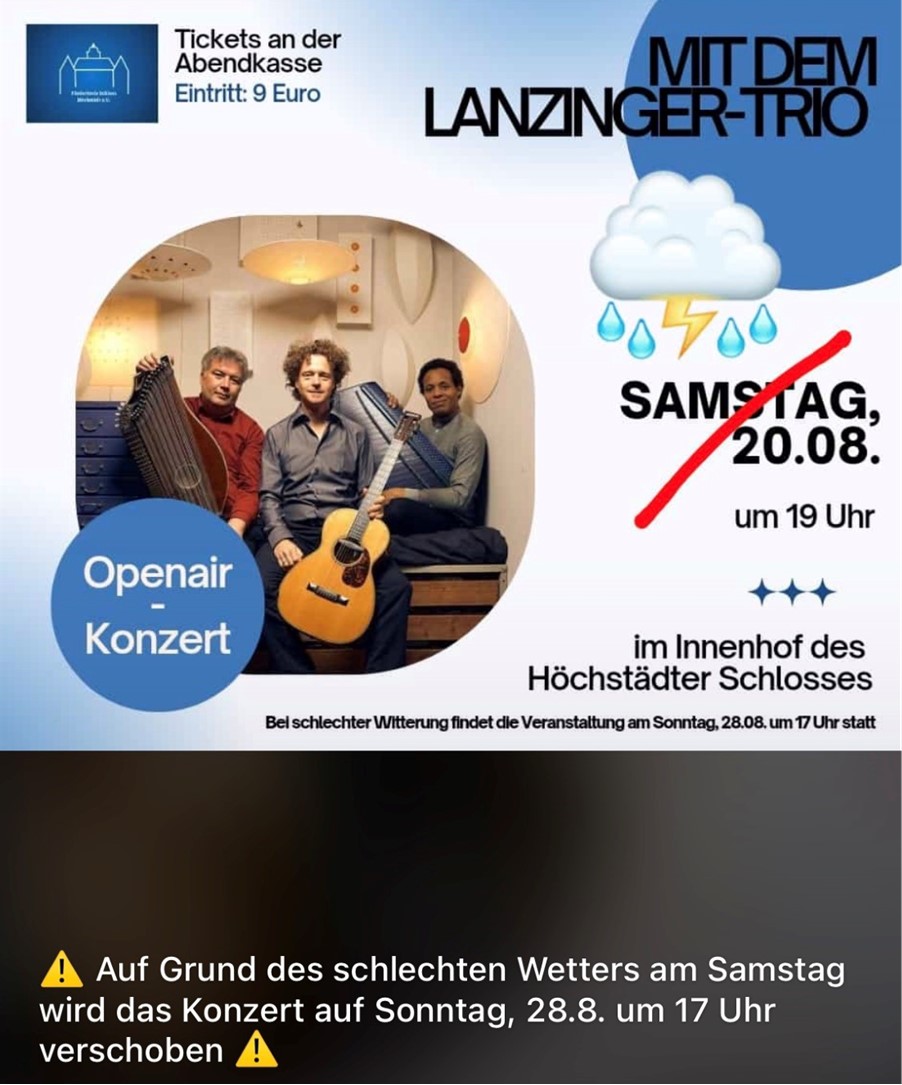 Am kommenden Samstag, 20.08.2022 dürfen wir endlich wieder live spielen. Wir sind ab 19:00 Uhr im Schlosshof in Höchstädt (Donau). Weitere Infos gibt es hier: https://www.schlosscafe-hoechstaedt.de